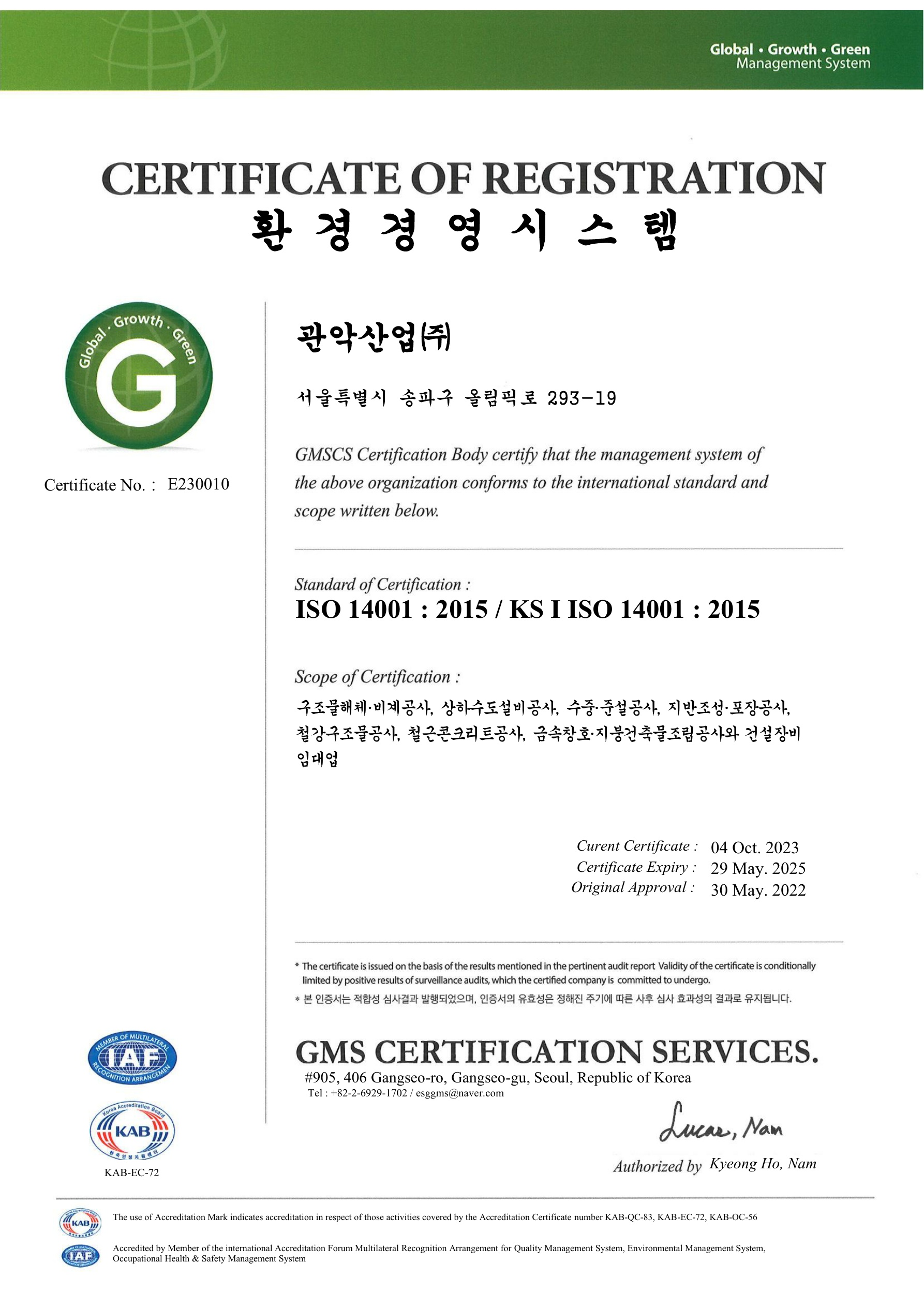 지에이이노더스는 시대적 흐름과 환경 문제해결에 기여하기 위해 국제 표준화 기구(International Organization for Standardization)에서 국제 인증한 환경경영시스템 ISO 14001을 취득하였습니다.